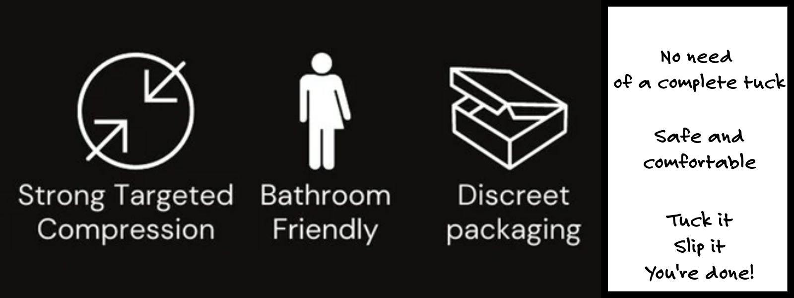 Compression of the materials will ensure tucking without the need of a gaff or duct tape. You can go to the bathroom anytime you want.